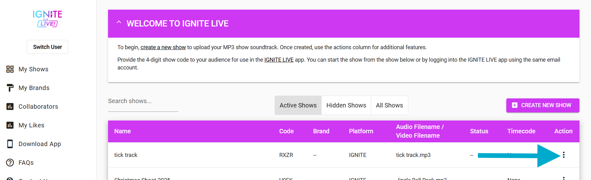 After logging in, you'll land on the My Shows page. Find your show in the list and click the three vertical dots in the Action column to open the show's options menu.