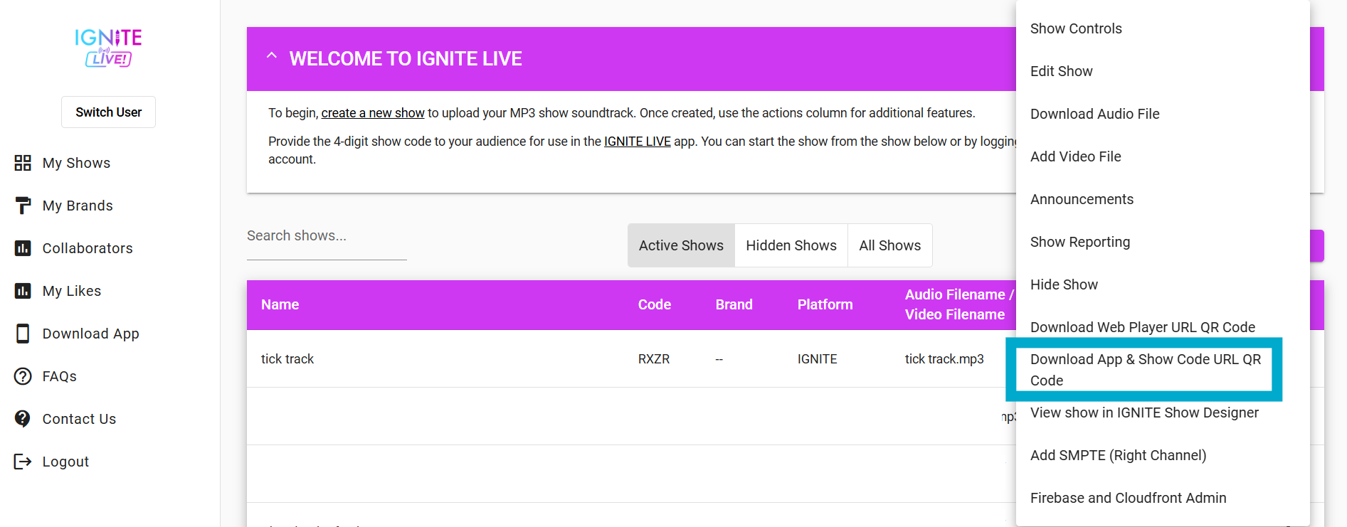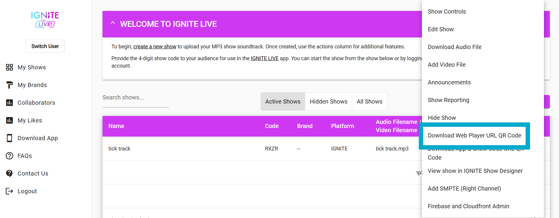 With the Action menu open, choose whether you'd like the QR code for the IGNITE LIVE! app, or webplayer.