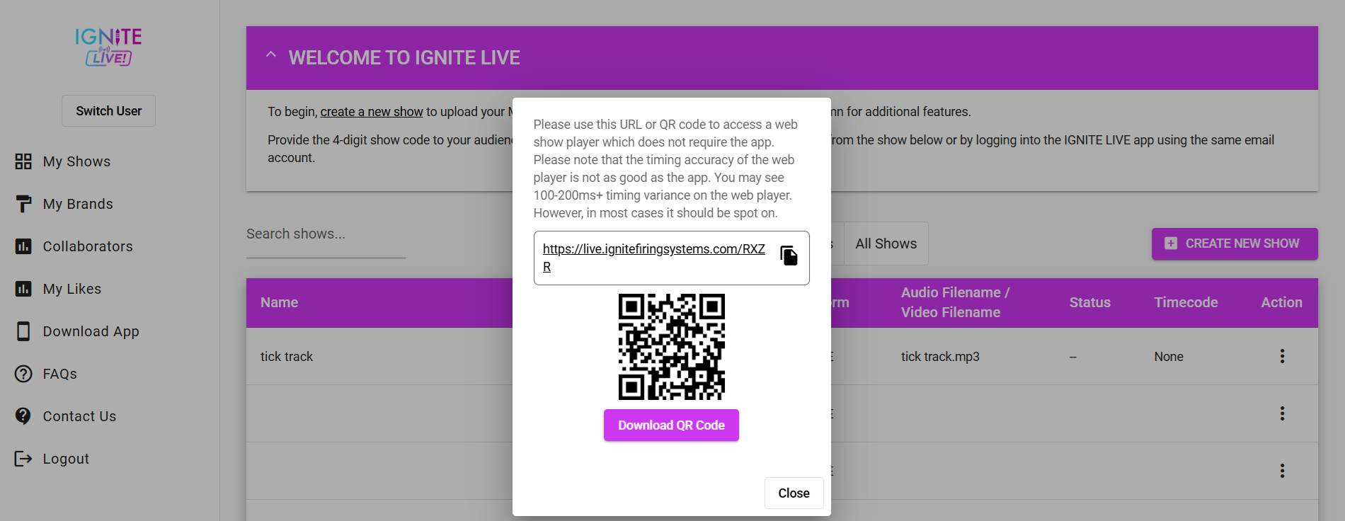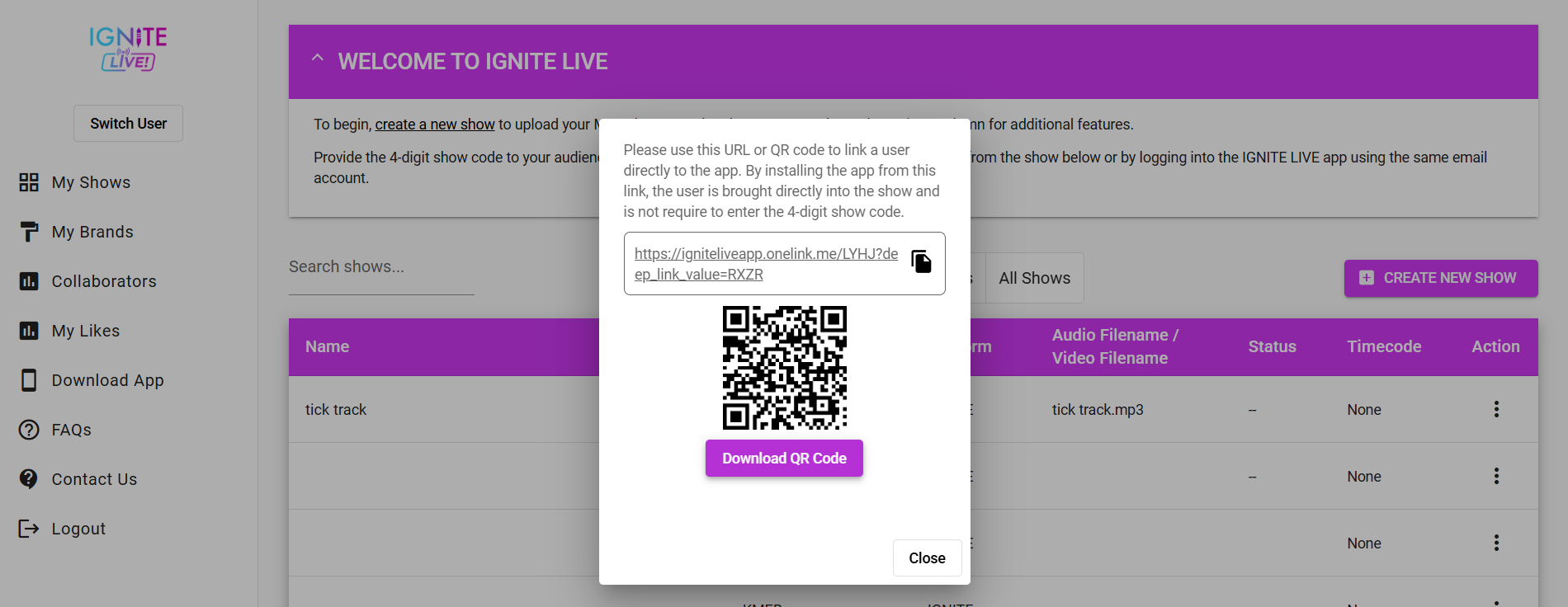 In addition to the four digit show code, you can download QR codes to share with your audience — one for the IGNITE LIVE! App and one for the Web Player. The App QR code will open the app directly to your show, or prompt users to download it if they don't have it installed, while the Web Player QR code will take them straight to your show's Web Player page.