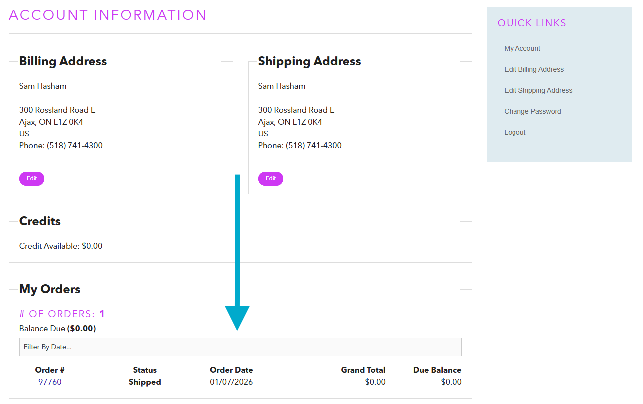 Once logged in, you'll land on your account dashboard where all of your previous orders are listed.
