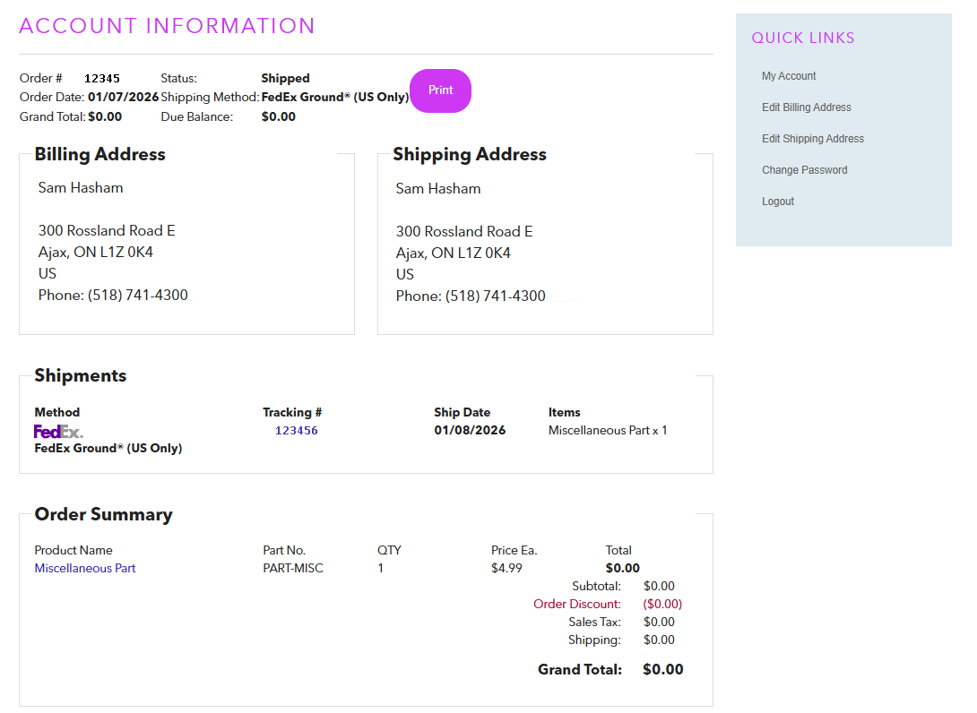 To access your full invoice and other details, click on the Order # to open the order's dedicated page. Here you can view a full order breakdown, print your invoice, and check tracking details.